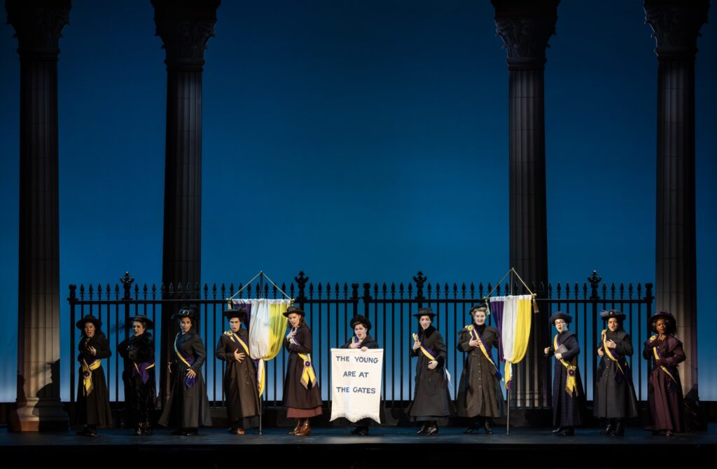 From the opening strains of the period-perfect ragtime-syncopated “Let Mother Vote,” maternally led by Mary Grandy‘s Carrie Chapman Catt and backed by a vocally powerful ensemble, Suffs makes it clear: this isn’t a museum piece. It’s a movement. The storytelling feels urgent, strong, and emotionally immediate—never preachy, always human.