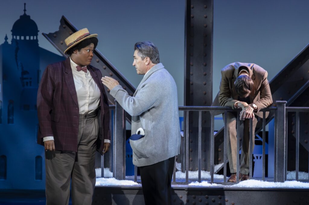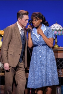 As Mary Hatch Bailey, Tamiko Robinson Steele radiates warmth, quiet confidence, and fierce devotion. Her Mary is not simply the supportive spouse—she’s the emotional compass of the story, grounding George even when he’s flailing hardest. Steele’s effortless sincerity elevates every scene she touches. From their scenes depicting George and Mary’s childhood friendship to their teenage flirtation, Steele’s sweet embodiment of Mary is palpable. The scene at the drugstore soda fountain when Mary leans over to George and whispers in his bad ear her devotion, I couldn’t help but have a little eye sweat. With Steele in the role, it’s no wonder George offers Mary the moon.