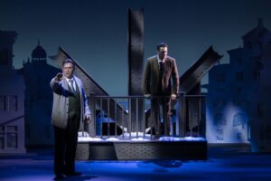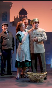 Her scenes with Tommy Anglim’s Kodaly are super-charged with electrically playful tension. Anglim’s Kodaly is smooth, sly, and charming in all the most infuriating ways. During their shared musical numbers—particularly Ilona, Anglim’s Kodaly delivers a somewhat bawdy, yet perfectly comedically timed riotous performance. Anglim’s delightfully narcissistic Kodaly and Wolff’s tough-but-tender Ilona feel like they walked straight out of a Golden Age film.