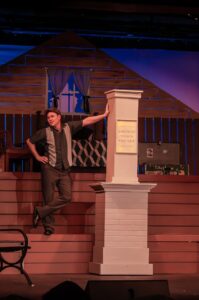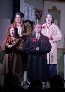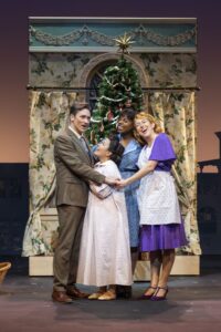 Among the remaining ensemble are Eric D. Pasto Crosby, who is first seen in a brief appearance as Mr. Bailey and a little more stage time as Nick the barkeep (question…did they really have Sports Bars called as such in the 1940s? It’s rhetorical. Sports Bars weren’t a thing until the 1960s, thus my only complaint about the set, for when Clarences shows George what life would have been like had he not been born, they visit the bar formerly owned by Martini, now emblazoned with a mirror-etched sign reading Nick’s Sports Bar). Aleia Eagleton and Darci Nalepa Elam appear throughout portraying various townspeople. Among their standout turns, Elam’s Ma Bailey is motherly perfection while her Tilley is flirty and fun. Then there’s the small in stature, but big in energetic presence of Eagleton as she is fabulously convincing and utterly enjoyable in the tiny, but pivotal role of Zuzu.