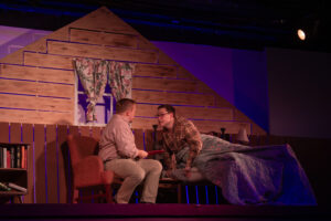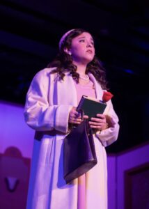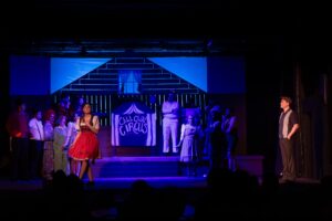 Choreographer Andrea Campbell, working in clear collaboration with director Aaron Gray, makes masterful use of The Keeton’s intimate stage. With a cast of twenty, filling the space without overwhelming it is no small feat, yet the production never once feels crowded. Instead, it feels alive. From kick lines to tap and everything in between, the variety of choreography reflects the musical’s tonal shifts while showcasing the ensemble’s versatility. One can only imagine the rigor of rehearsals required to master such range within spatial constraints, and the ensemble rises to the challenge with precision and enthusiasm. Director Gray deserves equal praise for staging that maximizes every inch of the performance area, creating dynamic stage pictures that feel expansive, an appropriate nod to the story’s 2003 cinematic retelling courtesy Tim Burton‘s film adaptation, despite the venue’s modest footprint.