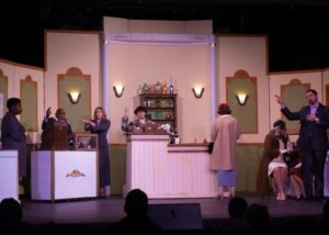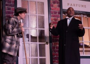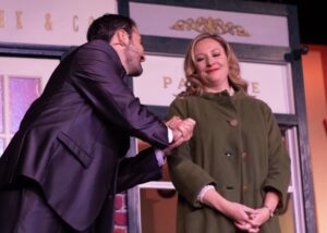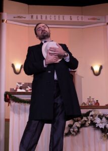Once again, The Keeton’s in-house scenic designer, Kevin Driver delivers a triumph and his She Loves Me set should be one of the most-talked-about elements of the production. Inspired by the 2016 Tony-winning Broadway revival’s transformative shop design, Driver creates an only slightly scaled-down Maraczek’s Parfumerie that feels timeless, elegant, and tactile. The mobile units shift the space effortlessly, inviting the audience directly into the warmth of the 1930s Budapest shop.