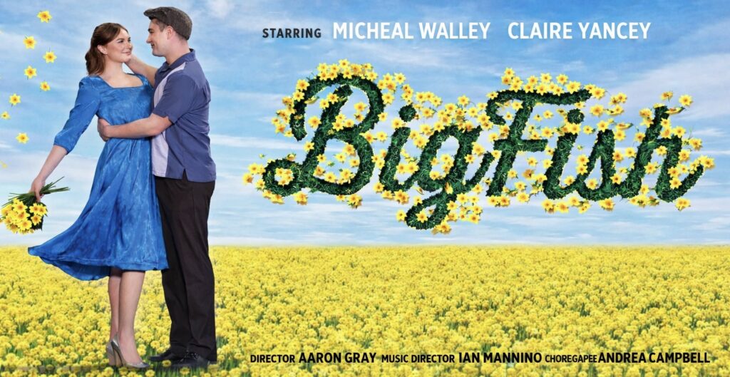 s Edward Bloom, Micheal Walley bursts onto the stage with charisma and conviction. From his first entrance, his speech pattern and delivery lands near Mark Twain’s distinctive Southern storytelling drawl — deliberate, charming, measured — and for some reason put me in mind of French Stewart’s Harry Solomon from “Third Rock from the Sun”, quick with an unexpected sarcastic bite. The blend gives Edward both homespun authenticity and razor-edged comedic timing, a balance that keeps the character from drifting into caricature. The subtle but effective vocal change between younger Edward to his more frail self in later years is quite interesting to take in.