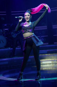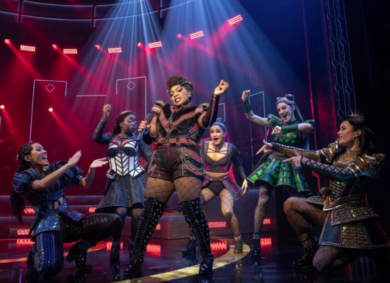 There’s an interesting shift in tone with Alizé Cruz (Katherine Howard) and “All You Wanna Do”. Her pink-and-black costume reflects youthful vitality layered with looming danger—the sweetness of pink undercut (no pun intended) by the severity of black. What begins flirtatious quickly curdles as the repetition of “All you wanna do, baby” exposes the song’s darker truth. As the lighting cools and the meaning sharpens, the visual contrast underscores just how trapped Howard truly is. It’s Britney‘s “Womanizer”, sing-songy and fun, but if the aggressor had access to the guillotine.
