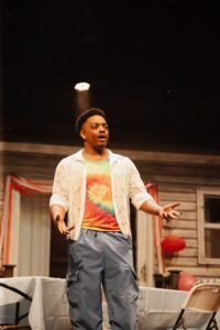 As Juicy, this retelling’s Hamlet, Julian “Joolz” Stroop delivers a performance that is instantly mesmerizing. Dressed in black, but with flare that lets us know they’re their own person deep down, Stroop’s Juicy is a stark contrast to the bright, bustling energy around them, Stroop embodies what it means to feel different within your own family. Their Juicy is wickedly sarcastic, deeply unsure of themself, yet painfully self-aware. Where Shakespeare’s Hamlet spirals toward destruction, Juicy wrestles with whether violence is the only inheritance available. Stroop captures the tension between rage and restraint with remarkable control. You can see the weight of expectation pressing in—the desire to prove themself to a father who was cruel in life and demanding in death. Stroop’s performance reflects the universal burden of feeling unseen, and when ultimately questioning the necessity of revenge, it lands with emotional clarity. Whether performing a telling karaoke number at the BBQ, sharing a laugh with friends, a more intimate moment with a lifelong crush or tense scenes with parental figures, Stroop steps up and shows out in a memorable Nashville Rep debut performance.