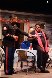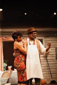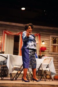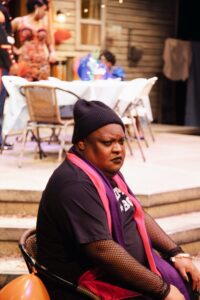 Persephone Felder-Fentress steps into a gender-switched Polonius role as Rabby, Larry and Opal’s mother, with sharp comedic precision. While Shakespeare’s Polonius is verbose and meddlesome, Rabby feels more direct and grounded. Felder-Fentress handles the humor effortlessly, but she also brings a relatable maternal complexity to the role. You know that female relative who always pinched your cheeks as a kid and inevitable asks “when are you getting yourself a girlfriend?” That’s Felder-Fentress’ Rabby. The dynamic between Rabby, Larry, and Opal textbook good christian family facade masking those things we don’t talk about beneath the surface. Y’all, during Rev’s pre-feast prayer, when I noticed Felder-Fentress’s Rabby clicking her bejeweled heels together in prayerful agreement to each thing Rev mentioned, I knew I longed for an invitation to the cookout!