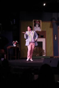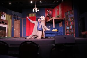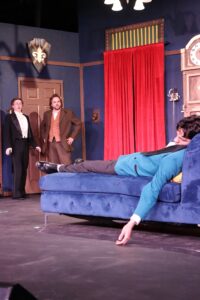 Keeton newcomer, Connor Boggs is tasked with the key role of Max. Initially cast in another role, Boggs stepped into the role of Max after the original actor had to drop out of the show. As Max and his mystery counterpart, Cecil, he figures out very early on that subtlety is overrated. Within the supposed seriousness of the murder mystery, for Cecil, once he gets a taste of audience laughter, it’s game over. He milks every moment for all it’s worth, turning even the smallest slip into a full-blown bit. That said, dressed in wardrobe that can only be described as a technicolor travesty—yes, the character is typically a bit of a dandy, but not quite so…flamboyant. Usually played as an overly confident community theatre actor with at least an initial modicum of subtlety, Bogg’s Cecil starts at 100mph and never slows down doing everything short of cartwheels from his stage entrance right on through to the final curtain. Under the direction of Bailey, Bogg’s Cecil is amped up and definitely played for laughs so much so that it runs the risk on a SNL skit that just doesn’t know when to stop. But still, within the craziness of this show, it somehow works.
