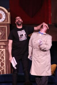 Now, I’ll be honest, having seen the National Tour back in 2018, and two more recent regional productions including last year’s Clarence Brown Theatre mounting, I am a huge fan of this work—so, when I first heard The Keeton was tackling The Play That Goes Wrong, I raised a somewhat doubting eyebrow. This is a show that, by design, demands a lot from a technical standpoint. It’s big, it’s intricate, and it requires a set that doesn’t just exist, but actively participates in the chaos. In a more intimate space like The Keeton, it’s fair to wonder if that kind of controlled destruction might be a bit…ambitious. And yet, credit where it’s due: this team doesn’t just meet the challenge—they lean into it with gusto. The result is a production that feels just as delightfully unstable as it should, without ever actually losing control.