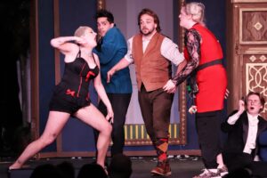 Adding to the mayhem is the Tech Chorus—Hannah Blough, MaryGrace Brittain, Hazely Merkle-Sanderson, Rich Moses, Advika Ravishankar, and the above-mentioned Wanderson Rezende—all blur the line between backstage and onstage with impeccable timing. The mantle falls early on…no biggie, a stagehand dressed in black will just stand there with arms extended holding whatever props were supposed to rest on the mantle. Problem solved. Their presence reinforces the idea that in this production, literally no one is safe and the old adage that the show must go on is of utmost importance.