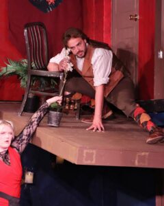 Aaron Gray’s Robert is the kind of community theatre actor who clearly believes he’s performing in Masterpiece Theatre, even as the world collapses around him. The fact that Gray is in or involved with nearly every Keeton production somehow added a if you know you know aspect to his role as Robert. As Thomas Collymoore, his dead-serious commitment in the face of utter nonsense makes every moment land harder, especially as the physical comedy ramps up and refuses to let him off easy. Kudos to his library scene. While the Keeton stage area does limit the intensity of the prospect of the second floor of the set completely collapsing, Gray’s physicality while keeping himself and all the props around his from falling away as the floor beneath him gives way, is gasping, belly-laughing joy to behold.